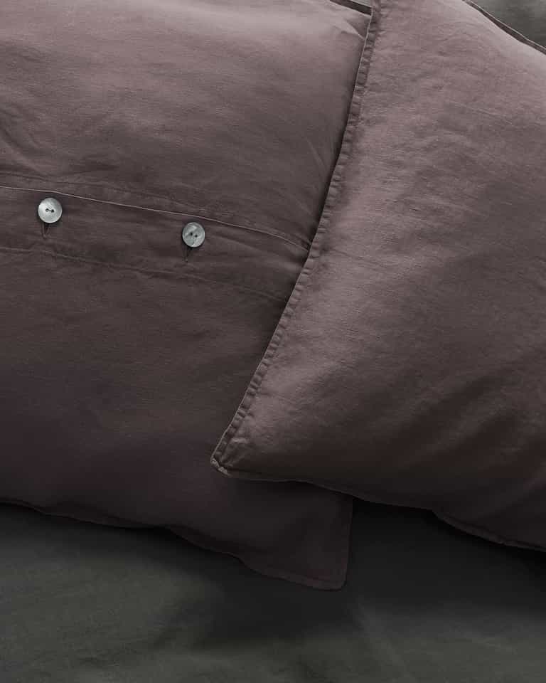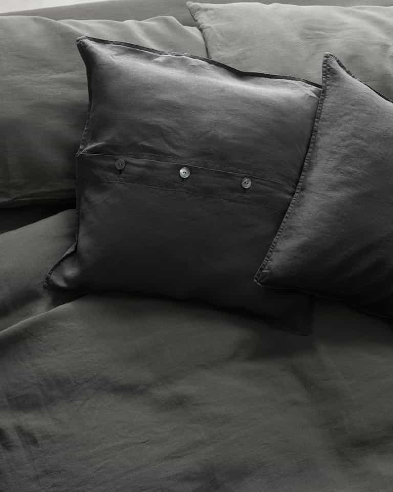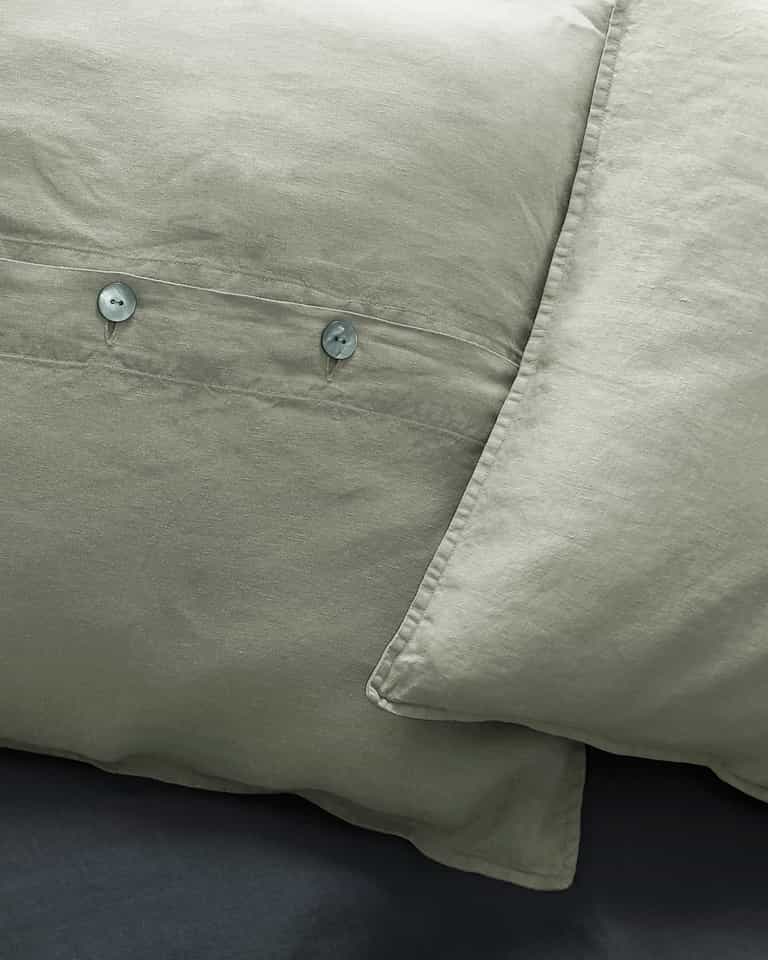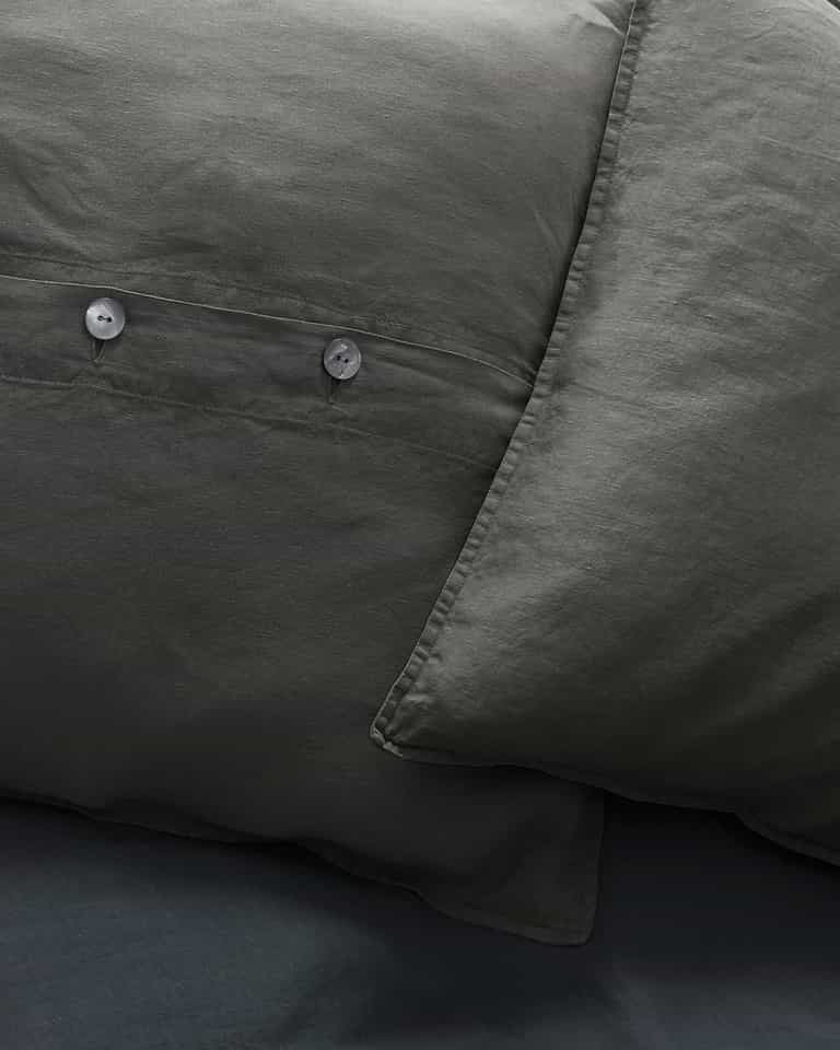 Rem Cushions Set from Society Limonta adds a classic, froissé linen-inspired look to living rooms and bedrooms. Its softened fabric is garment-dyed for rich color, machine washable with no ironing, and finished with a refined look thanks to mother‑of‑pearl buttons, making it easy to place on sofas, chairs, or beds.