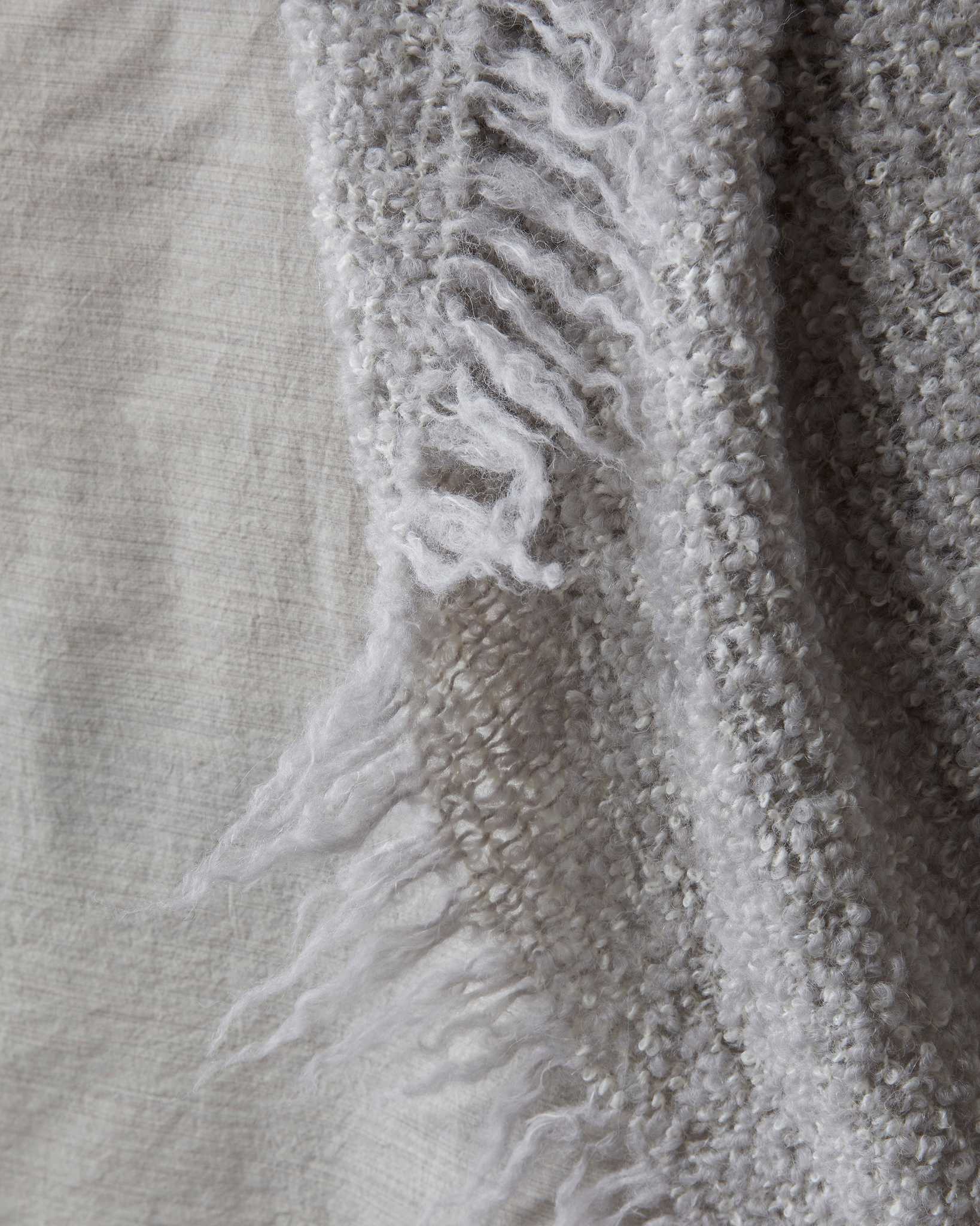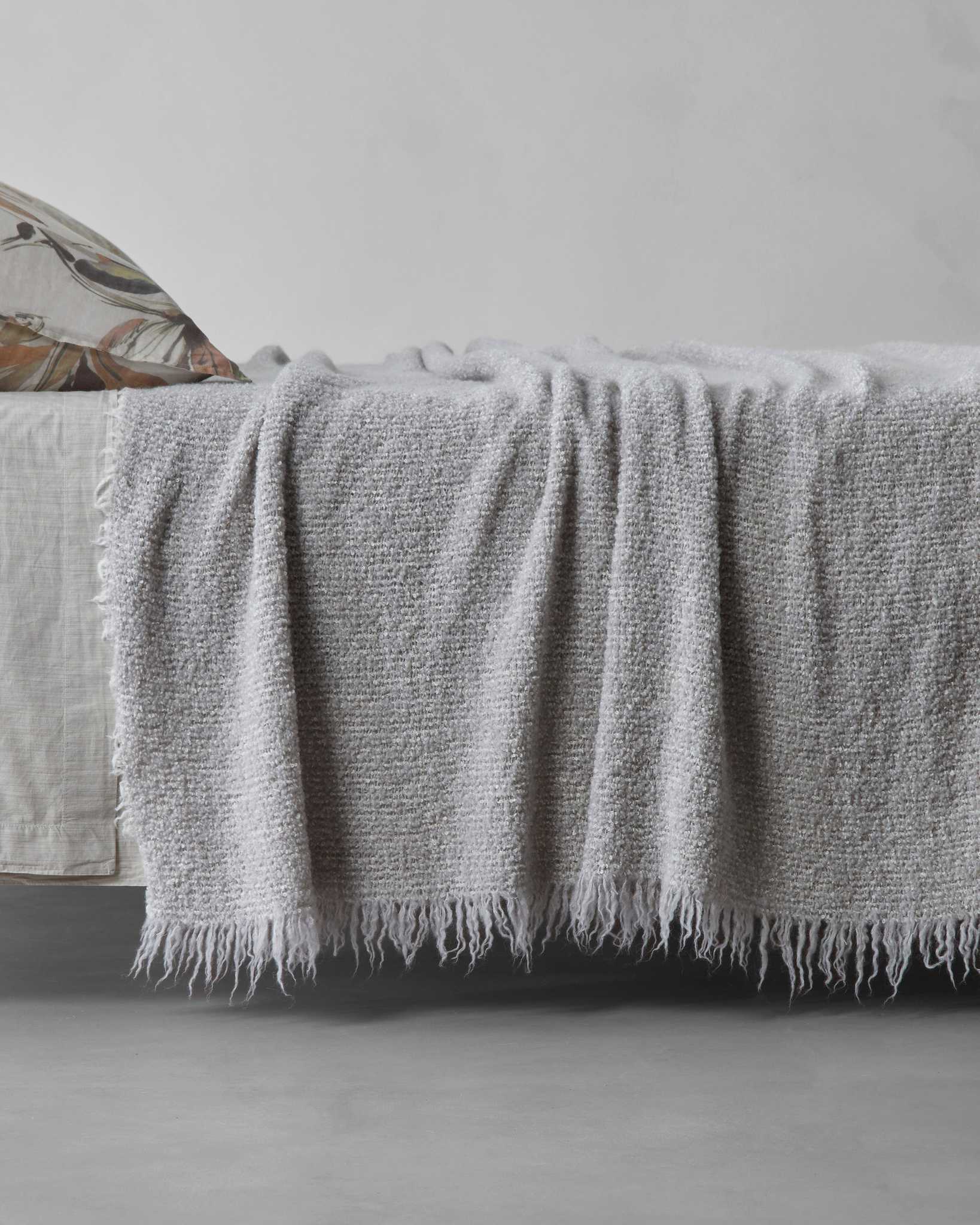 Tuis Blanket is a large, monochrome throw in a bouclé alpaca wool blend (70% alpaca, 30% wool) for natural warmth and a soft, cosy feel. Frayed edges add texture, the oversized design drapes over the bed for full coverage, and the 200 g/m² weight keeps warmth balanced and breathable.